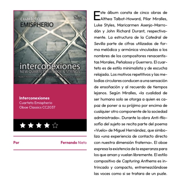 World Premiere recordings of works commissioned by Cuarteto Emispherio and composed by Althea Talbot-Howard, Pilar Miralles, Luke Styles, Maricarmen Asenjo-Marrodán and John Richard Durant