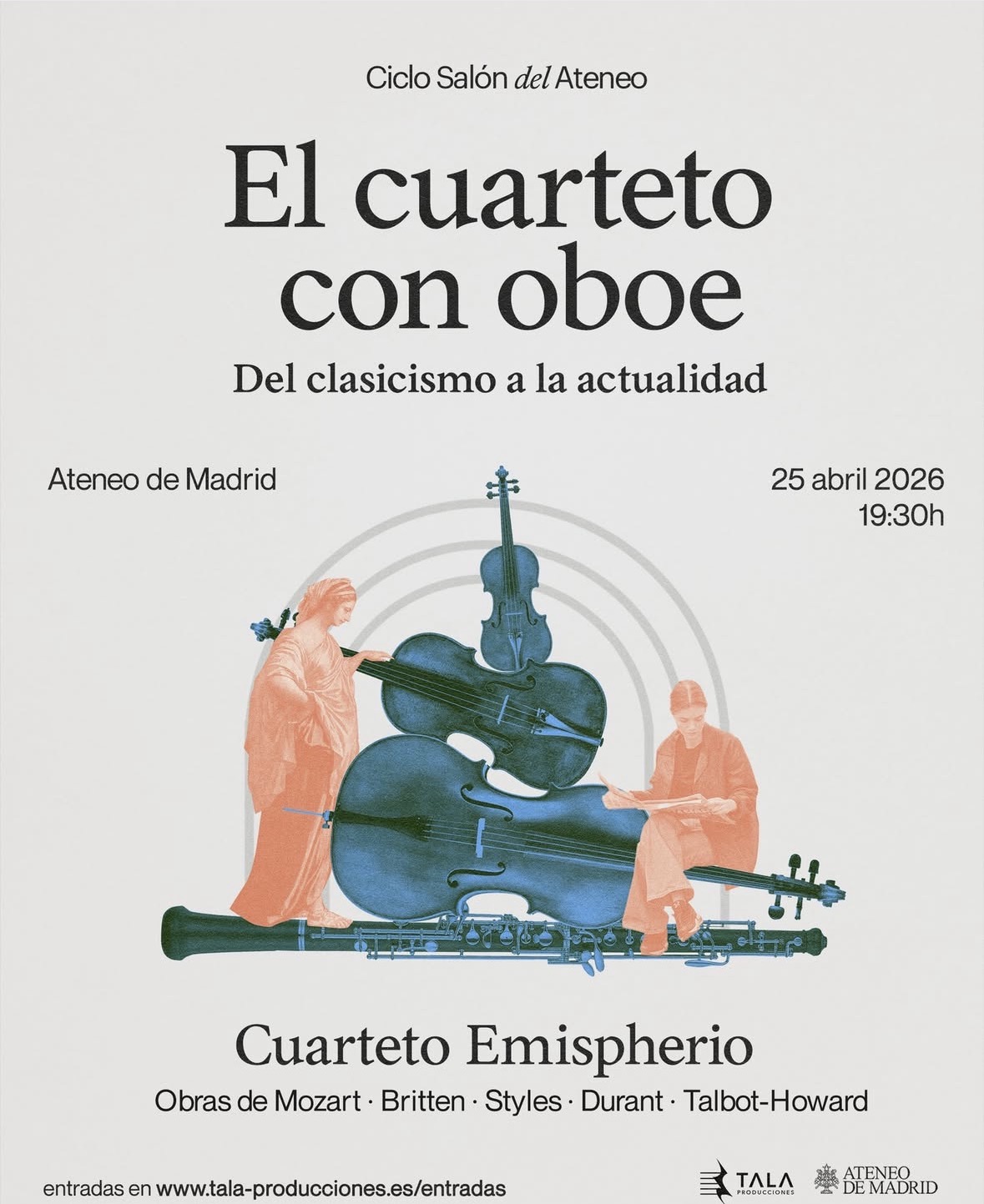 Salón del Ateneo, Madrid. 25 de abril, 2026. Obras de Mozart, Britten, Styles, Durant y Talbot-Howard. Más información: https://www.tala-producciones.es/salon-del-ateneo/