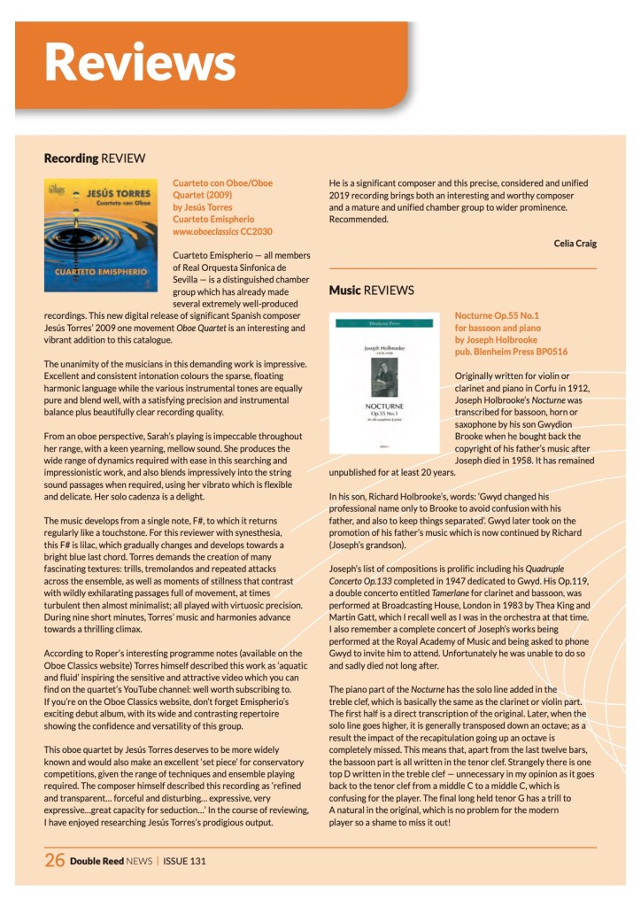 Many thanks to Celia Craig for her review in the British Double Reed Society Double Reed News magazine, Spring 2022, issue 131.