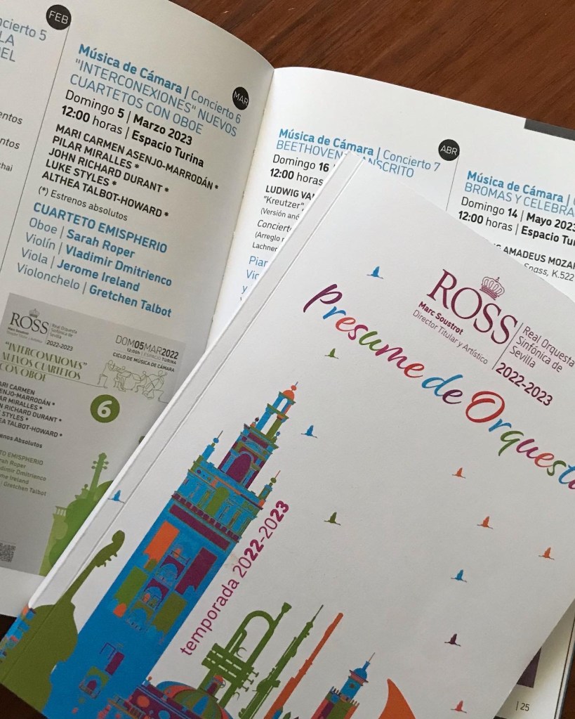 «Interconexiones: New Oboe Quartets» will be premiered by the Cuarteto Emispherio during the 2022-2023 ROSS chamber music cycle: XXXIII Ciclo de Música de Cámara on Sunday March 5, 2023 at 12:00 at the “Espacio Turina” concert hall. Please see the new “programación de la temporada 2022-2023” recently published: https://rossevillatv.com