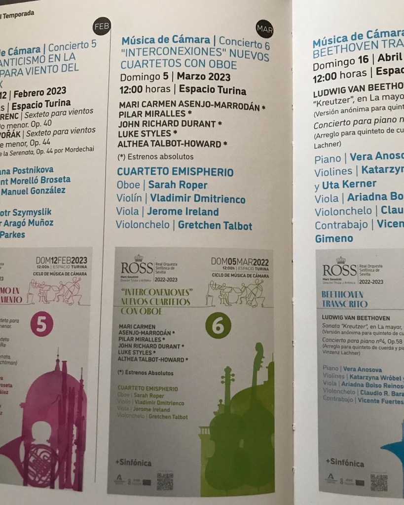 El estreno del proyecto «Interconexiones: Nuevos Cuartetos con Oboe” será durante el XXXIII Ciclo de Música de Cámara de la ROSS. Domingo 5 de marzo de 2023 a las 12:00 en el Espacio Turina, Sevilla.